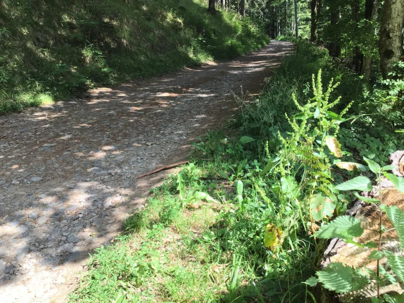 En suivant toujours la croix bleue droite, redescendez jusqu’au chemin de départ, qui vous conduira à la première bifurcation. À cet endroit, prenez le sentier qui vous ramènera directement au parking du Schützle.